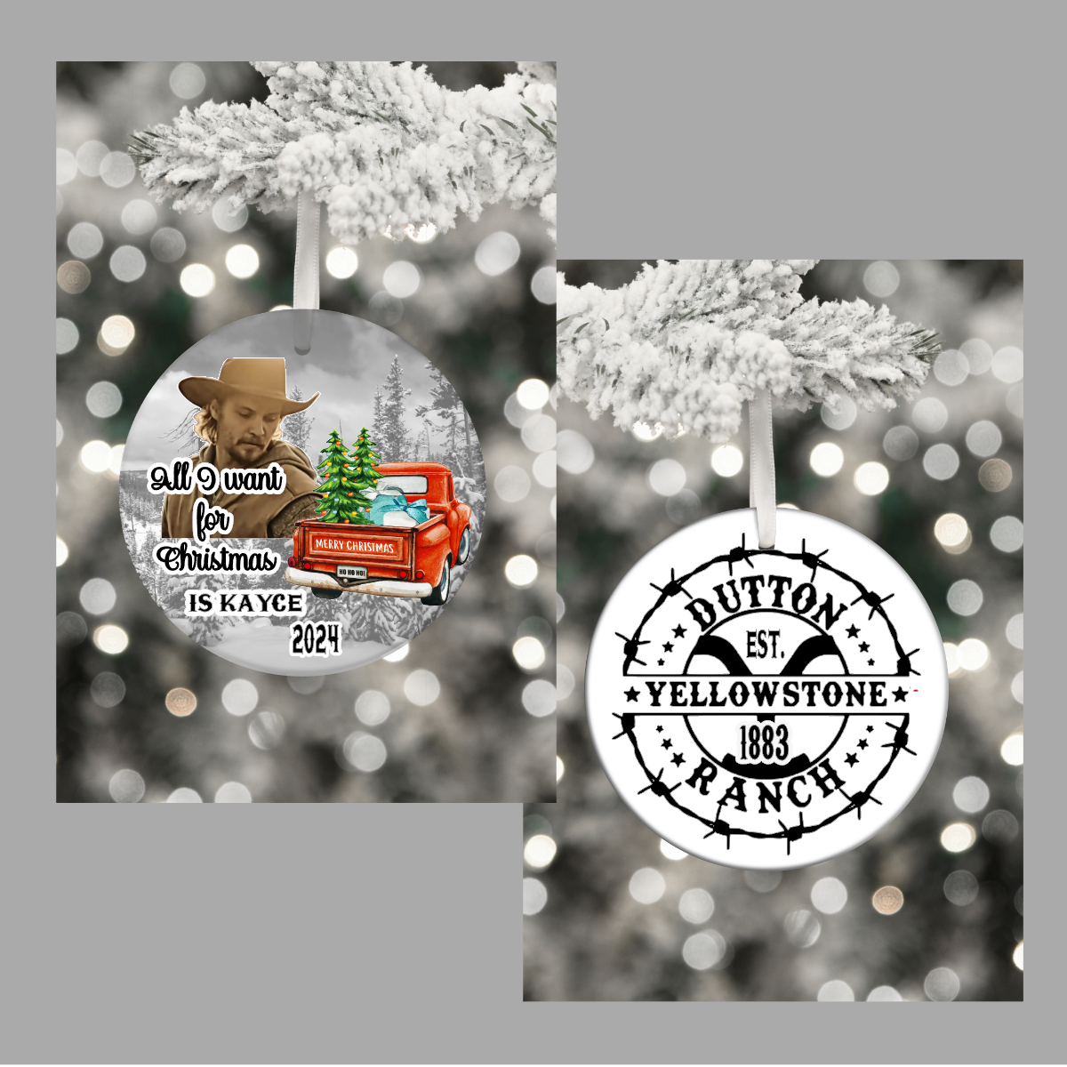 “Round ceramic ornament featuring Kayce Dutton from Yellowstone, with a rugged Western look and cowboy hat. The background showcases the Red Christmas Truck and the Yellowstone Mountains. On the other side is the Yellowstone Ranch the iconic ‘Y’ brand logo. And in bold Western-style lettering, it reads ‘All I Want for Christmas is Kayce.’ Edged with subtle holiday touches like holly leaves and pinecones, the ornament hangs with a red ribbon or leather string, blending holiday cheer with rustic ranch vibes.”