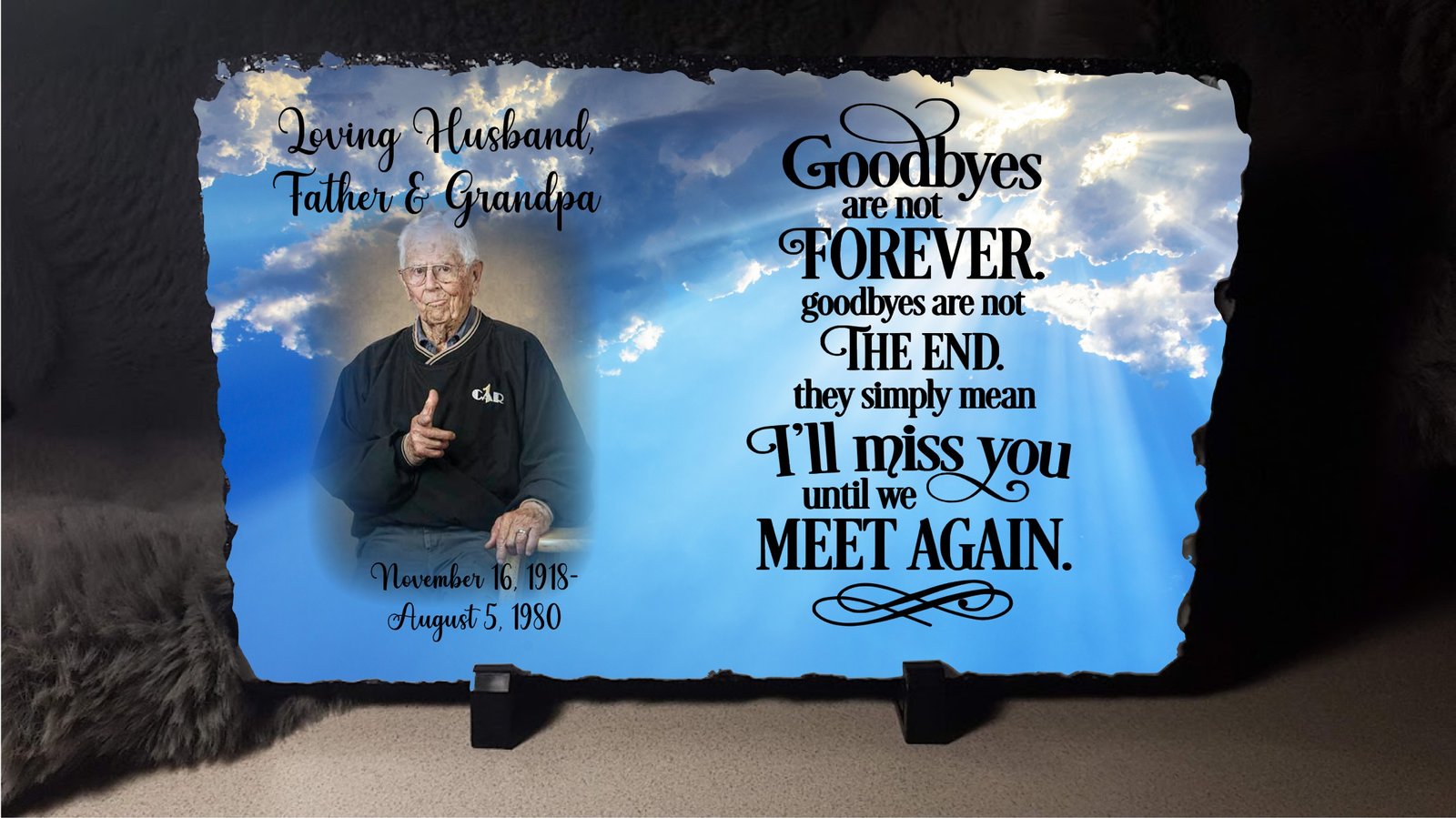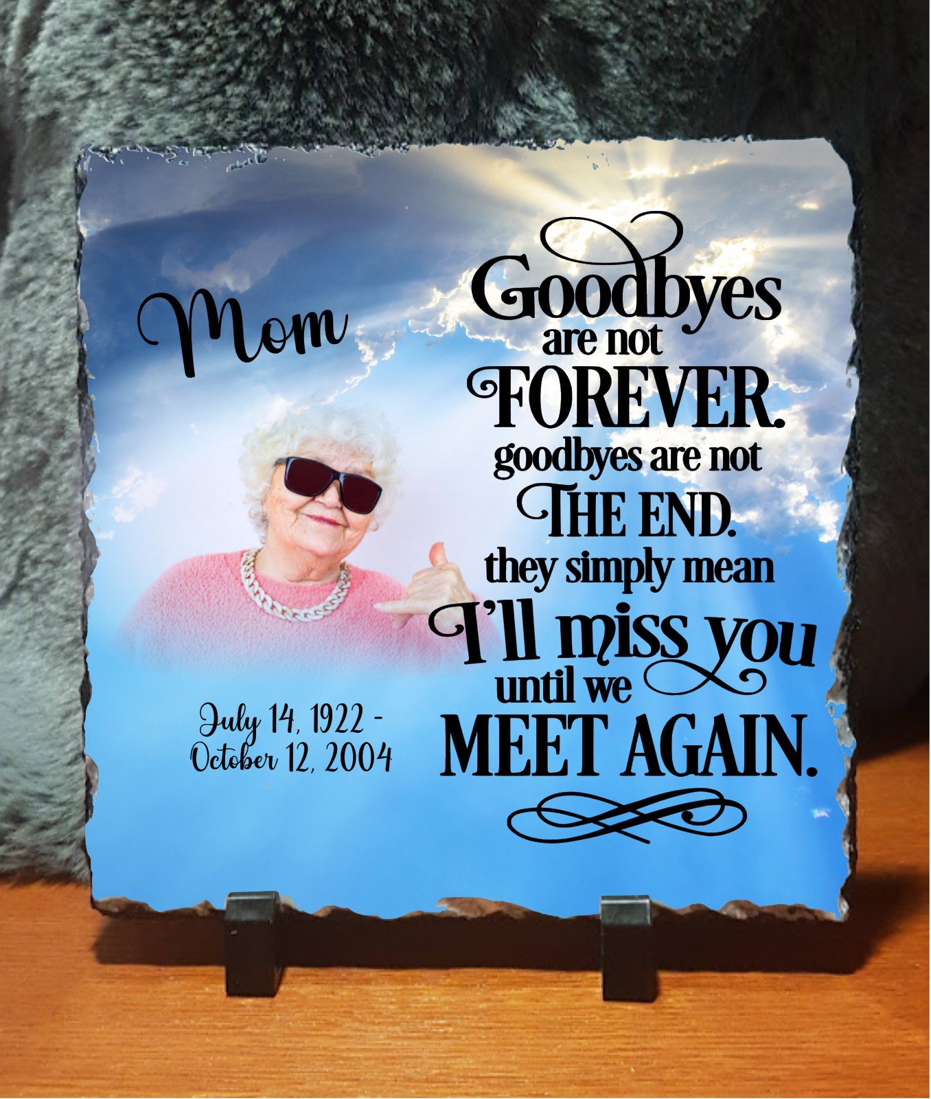 Goodbye’s Are Not Forever Memorial Photo Slate is the perfect way to keep a memory of a loved one close. Memorial photo slates offer a touching tribute to loved ones who have passed away. These personalized keepsakes feature a cherished photograph of the departed, expertly printed onto high-quality slate. Each slate can be customized with meaningful details such as the individual’s name, dates of birth and passing, and heartfelt messages or quotes. Available in various shapes, sizes, and finishes, memorial photo slates provide a timeless and elegant way to honor the memory of those we hold dear. Displayed in homes, offices, or special locations, these heartfelt remembrances serve as lasting symbols of love and cherished memories.
