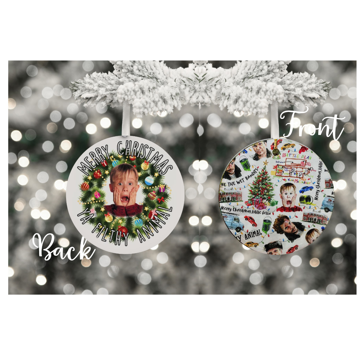 A “Merry Christmas Ya Filthy Animal” sublimation ornament is a festive, humorous decoration inspired by the famous line from the movie Home Alone 2. The ornament features a playful design with bold, holiday-themed typography. Typically, it showcases vibrant colors such as red, green, and white, evoking the classic Christmas spirit. The phrase “Merry Christmas Ya Filthy Animal” is prominently displayed, often with fun, decorative elements like snowflakes, reindeer, Christmas trees, or lights in the background. This ornament is perfect for adding a cheeky, nostalgic touch to holiday décor. It’s printed on durable material for lasting use year after year.