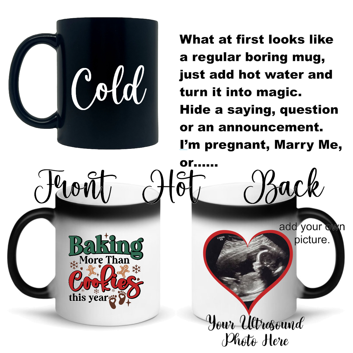 What appears to be just an ordinary mug, add hot water and your personalized images, sayings or even your pregnancy announcement magically appear. Kids absolutely love these with their favourite super hero on it, or want to make a statement or announcement with shock and wow (an ultrasound picture) or ask a question (Will You Marry Me). The possibilities are endless. Create your own or choose from our designs.