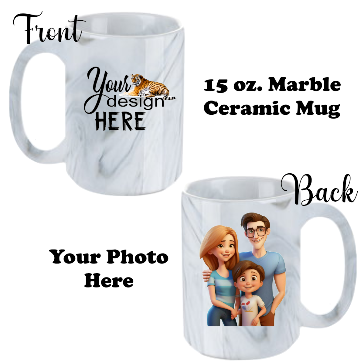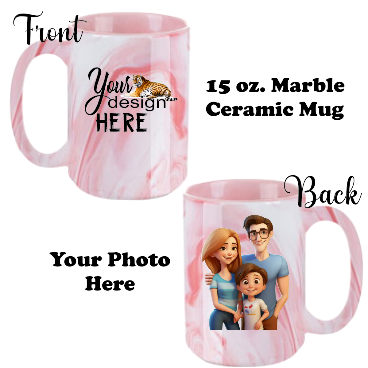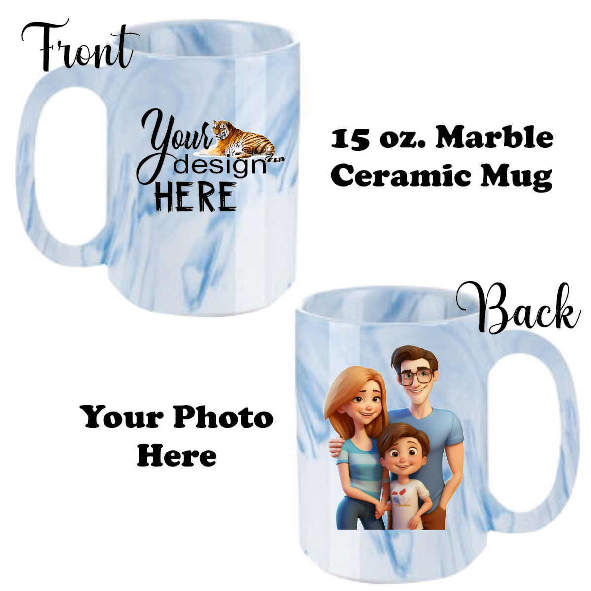 Unleash your creativity with our Personalized 15 oz Marble Mug! Crafted with a stunning marble finish, this premium ceramic mug makes your morning coffee or evening tea an extra special experience. Customize it with your name, a meaningful quote, or a design of your choice to make it truly unique. Perfect for gifting or adding a personal touch to your drinkware collection, this mug is durable, dishwasher-safe, and built to last. Whether you’re sipping at home, at the office, or giving as a thoughtful gift, this custom marble mug blends style and function effortlessly.